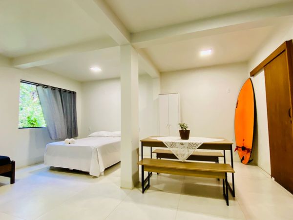 Apartamento aconchegante e confortável, com cozinha, acesso à internet e ventilador. Possui um amplo deck em frente ao apatamento com vista para a mata nativa preservada e um pequeno córrego d´água que proporciona uma experiência relaxante com o barulhinho da água. Local tranquilo e seguro, pertinho da praia e da área central com estacionamento privativo. Tudo que você precisa para desfrutar de dias agradáveis neste lugar rodeado de natureza!